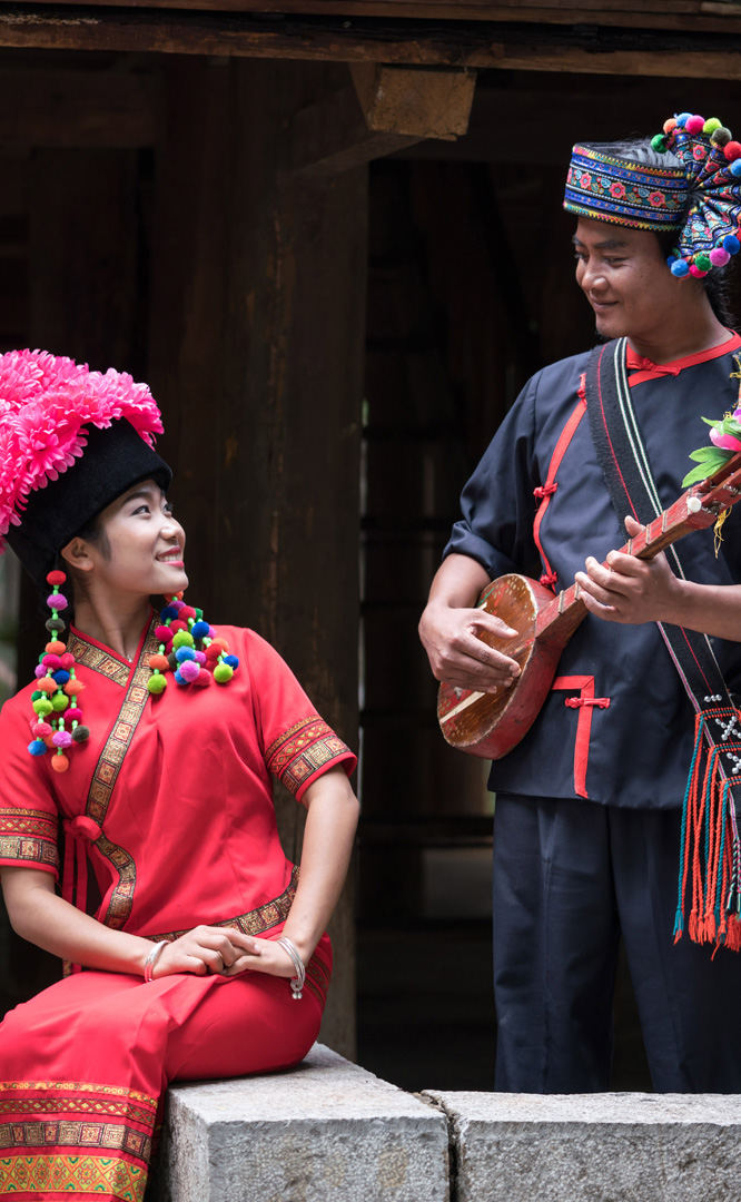 云南壯族主要聚居在文山州,人口114萬,民間的村寨大多依山傍水。壯族擅長種植水稻,有太陽崇拜和長老崇拜的風(fēng)俗,視銅鼓為重器,厚愛銀飾,善烹制五色花米飯,能歌善舞,熱情好客。進入景區(qū)壯族村,迎面有祭祀龍王的龍柱,兩邊是先民繪制的天王崖畫和為紀(jì)念傳說洪水泛濫時幫助先民度過劫難而建的石葫蘆亭。祭祀玉皇大帝的昊天閣和傳說能驅(qū)邪納福的碩大銅鼓聳立在廣場兩側(cè)。桿欄式和麻欄式民居、壯族青年社交休憩的“情廊”、村...
